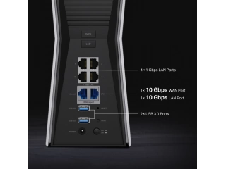 Puertos duales 10G: 1× puerto WAN de 10 Gbps + 1× puerto LAN de 10 Gbps + 4× puertos LAN de 1 Gbps + 2× puertos USB 3.0, para transferencias y descargas de archivos grandes más rápidas, streaming fluido, juegos inmersivos y mucho más.