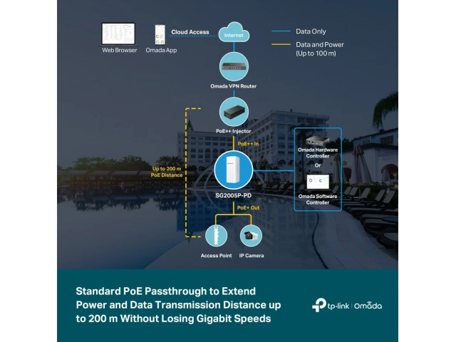 Distancia PoE de hasta 200 m: El estándar PoE Passthrough duplica la distancia de transmisión de la fuente PoE al dispositivo de 100 m a 200 m sin perder la velocidad gigabit, perfecto para cámaras de vigilancia y puntos de acceso de largo alcance.