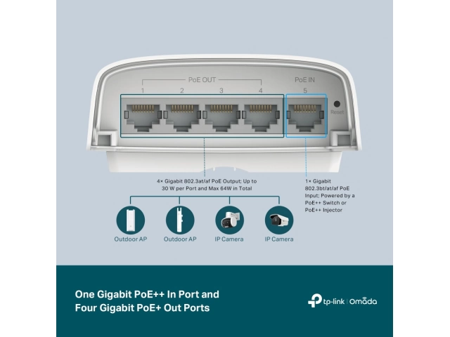 1 puerto Gigabit PoE++ de entrada y 4 puertos PoE+ de salida: Admite hasta 64 W / 44 W / 19 W/ 6 W de salida PoE cuando se alimenta con 802.3bt Tipo 4 (90 W), 802.3bt Tipo 3 (60 W), 802.3at y 802.3af PoE, respectivamente.
