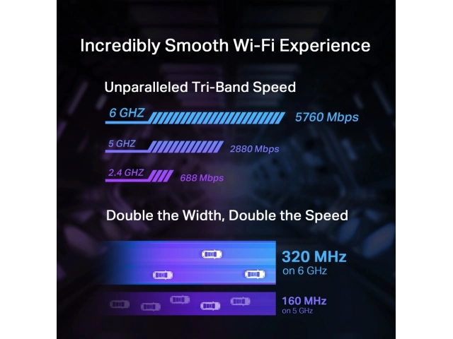 Velocidad tribanda incomparable : aumente su velocidad general hasta 5760 Mbps (6 GHz) + 2880 Mbps (5 GHz) + 688 Mbps (2,4 GHz )