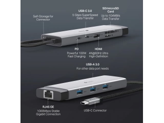 Concentrador USB-C 9 en 1: UH9120C convierte un solo puerto USB-C en 9 puertos con HDMI 4K a 60 Hz, Ethernet de 1 Gbps, SD y microSD UHS-I, suministro de energía de 100 W, 1 puerto de datos USB-C, 3 puertos de datos USB-A.