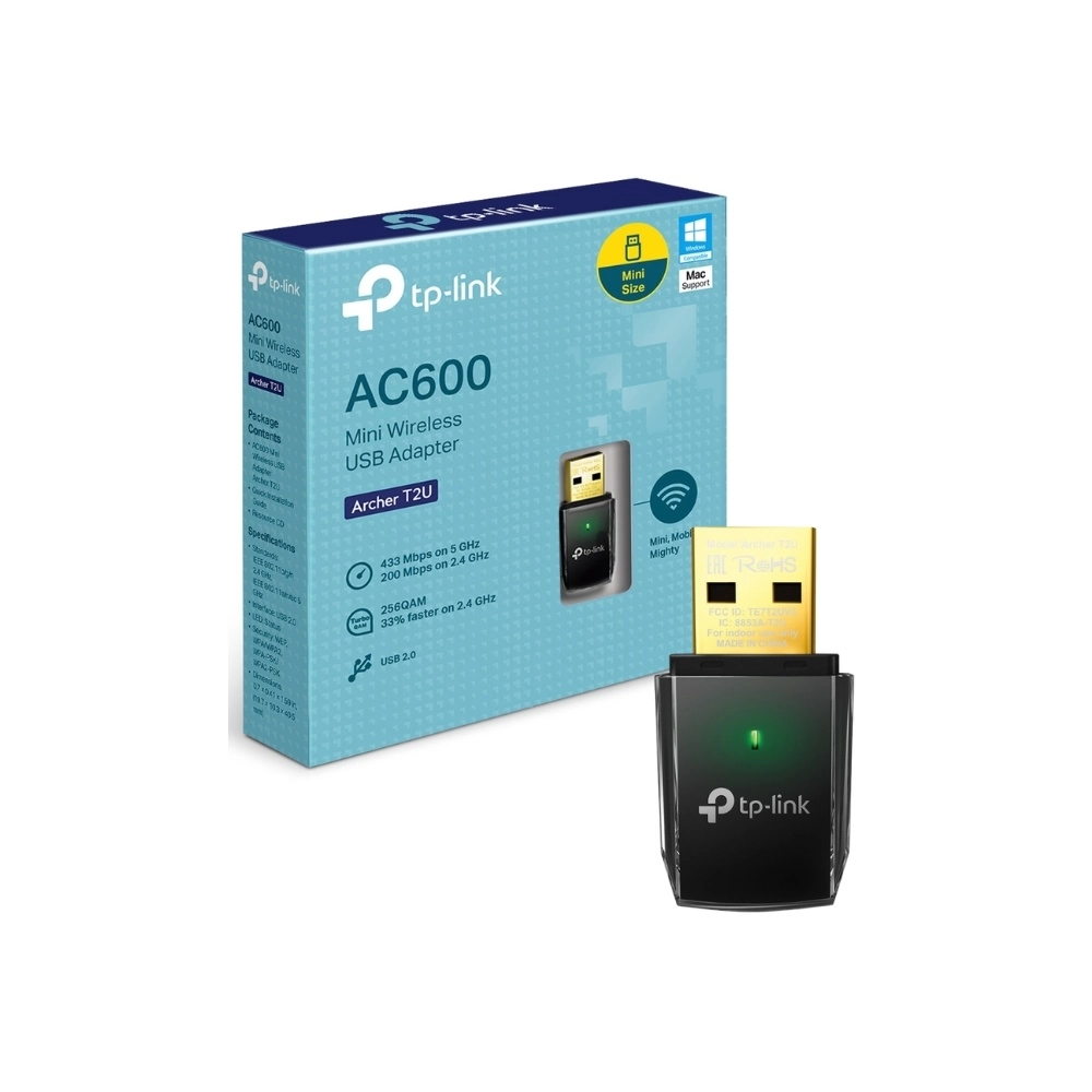 Adaptador, Inalámbrico, USB, TP-LINK, Archer T2U, AC600, Dual Band, 5 GHz (433 Mbps), 2.4 GHz (200 Mbps), USB 2.0, tarjeta red