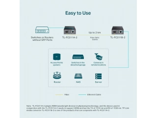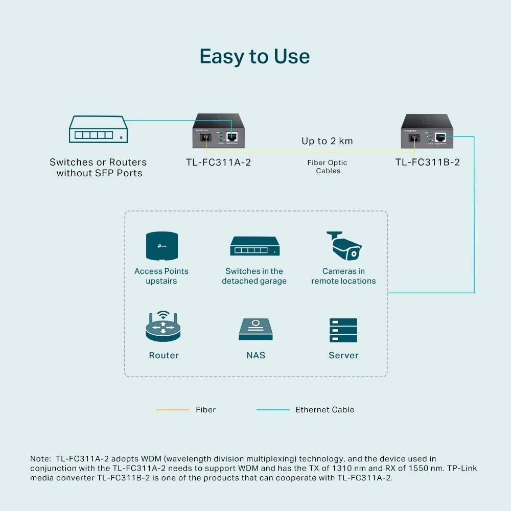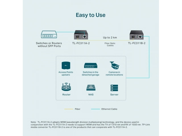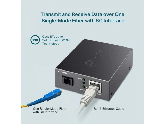 TL-FC311A-2 adopta la tecnología WDM (multiplexación por división de longitud de onda), que ayuda a enviar y recibir datos a una distancia de hasta 2 km con solo una fibra monomodo, lo que ahorra la mitad del costo de implementación del cable para los clientes. TL-FC311A-2 transmite datos a una longitud de onda de 1550 nm y recibe datos a una longitud de onda de 1310 nm en fibra óptica. Por lo tanto, el dispositivo terminal utilizado junto con el TL-FC311A-2 debe enviar datos a una longitud de onda de 1310 nm y recibir datos a una longitud de onda de 1550 nm. TP-Link otro convertidor de medios