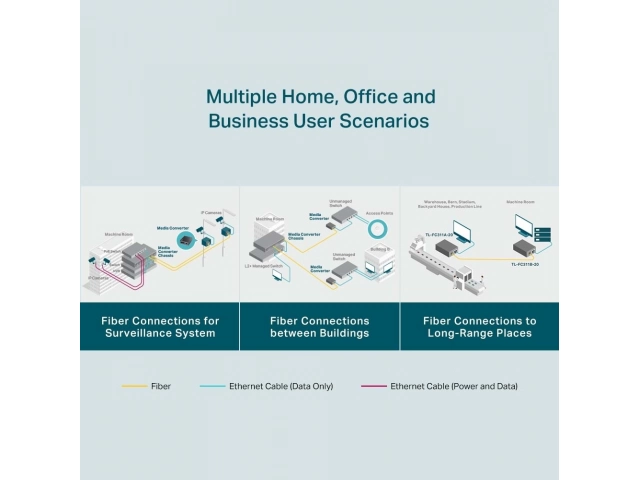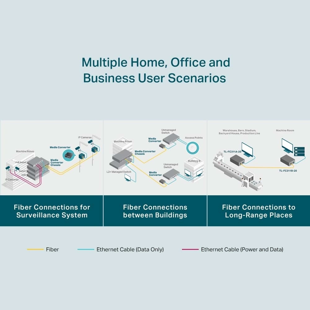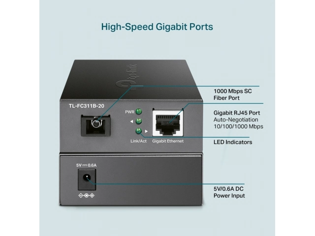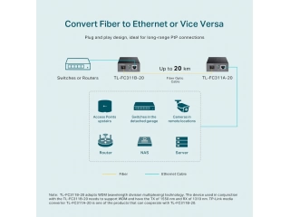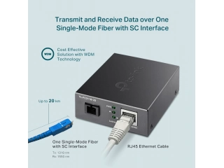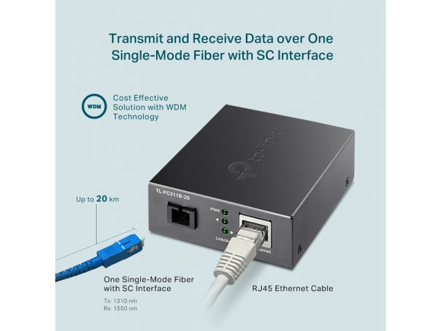 TL-FC311B-20 adopta la tecnología WDM (multiplexación por división de longitud de onda), que ayuda a enviar y recibir datos a una distancia de hasta 20 km con solo una fibra monomodo, lo que ahorra la mitad del costo de implementación del cable para los clientes. TL-FC311B-20 transmite datos a una longitud de onda de 1310 nm y recibe datos a una longitud de onda de 1550 nm en fibra óptica. Por lo tanto, el dispositivo terminal utilizado junto con el TL-FC311B-20 debe enviar datos a una longitud de onda de 1550 nm y recibir datos a una longitud de onda de 1310 nm. TP-Link, otro convertidor de medios