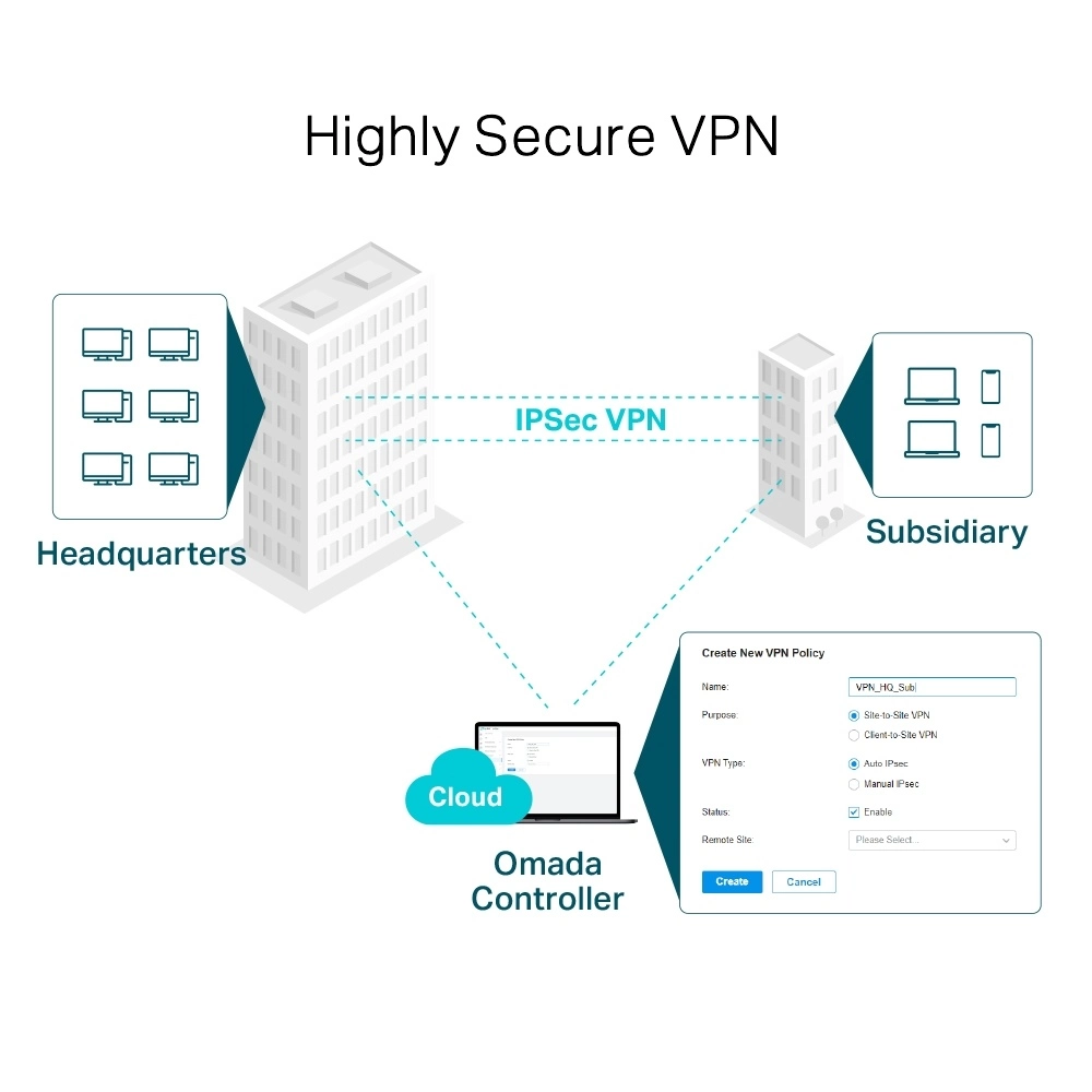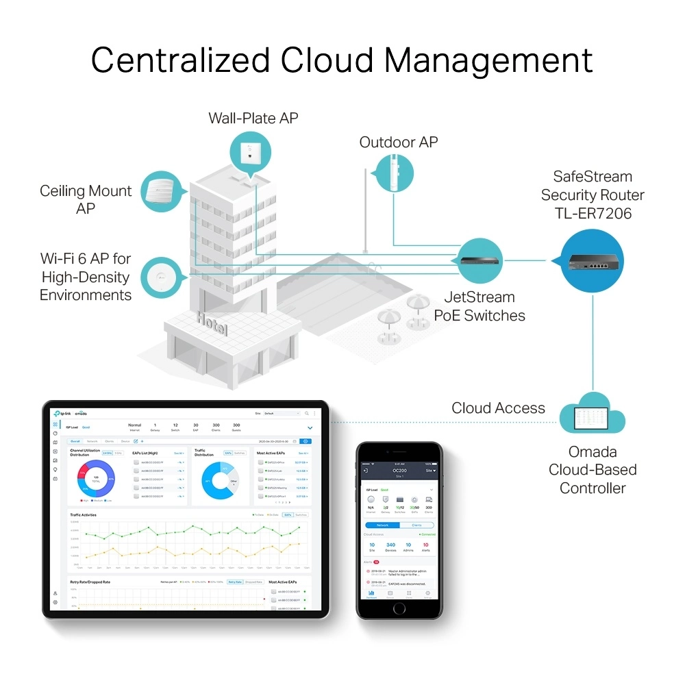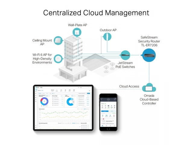 Integrado en Omada SDN: Zero-Touch Provisioning (ZTP), Administración centralizada en la nube y monitorización inteligente.