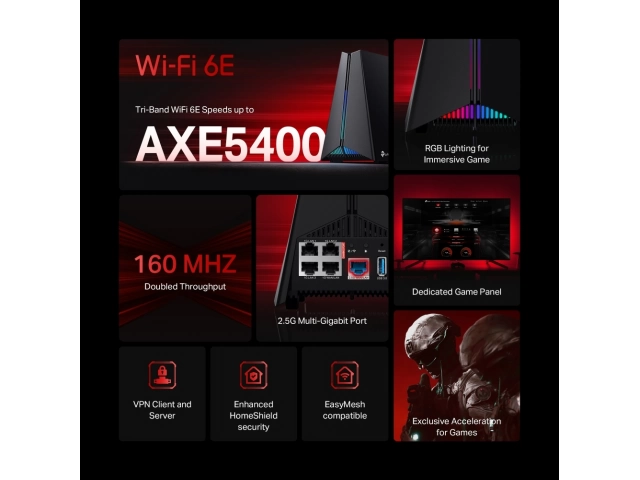 Router, Gaming, TP-Link, Archer GXE75, AXE5400, WiFi 6, Tri-Band, 6 GHz (2402), 5 GHz (2402), 2.4 GHz (574 Mbps), Puertos Ethernet, 4 Antenas, gamer