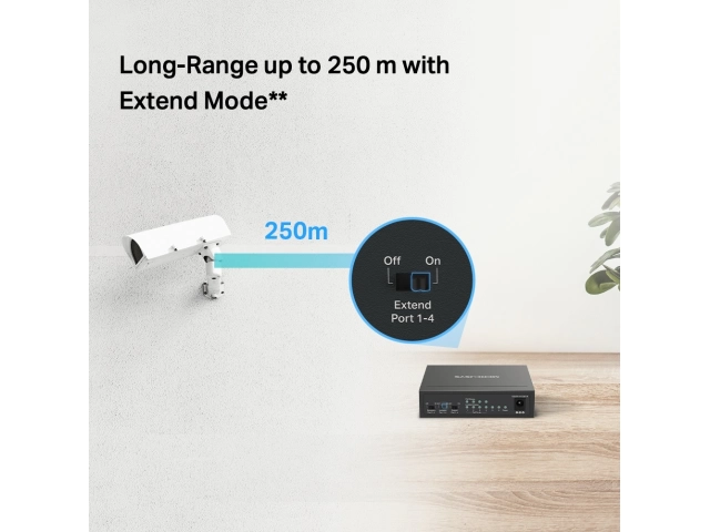 Largo alcance hasta 250 m: Aumenta la distancia de transmisión PoE hasta 250 m mediante el modo Extend.