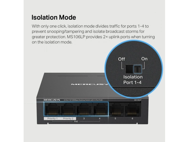 2 puertos de enlace ascendente: MS106LP proporciona 2 puertos de enlace ascendente cuando se activa el modo de aislamiento. Uno para conectarse a Internet y otro para conectarse al NVR.
