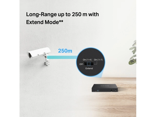 Largo alcance de hasta 250 m: Aumenta la distancia de transmisión PoE hasta 250 m mediante el modo Extend.