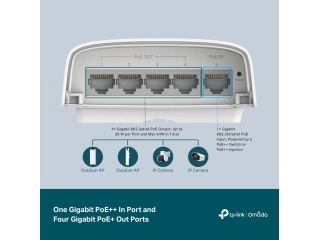 1 puerto Gigabit PoE++ de entrada y 4 puertos PoE+ de salida: Admite hasta 64 W / 44 W / 19 W/ 6 W de salida PoE cuando se alimenta con 802.3bt Tipo 4 (90 W), 802.3bt Tipo 3 (60 W), 802.3at y 802.3af PoE, respectivamente.