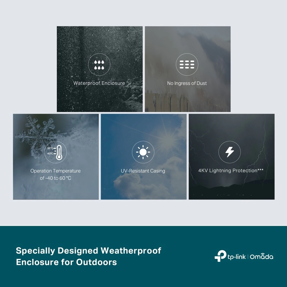 Resistente a la intemperie: Carcasa IP55 resistente al agua, al polvo y a los rayos UV. Las temperaturas de funcionamiento de -40 a 60 °C y la protección contra rayos 4KV garantizan además un funcionamiento estable frente a las duras condiciones exteriores.