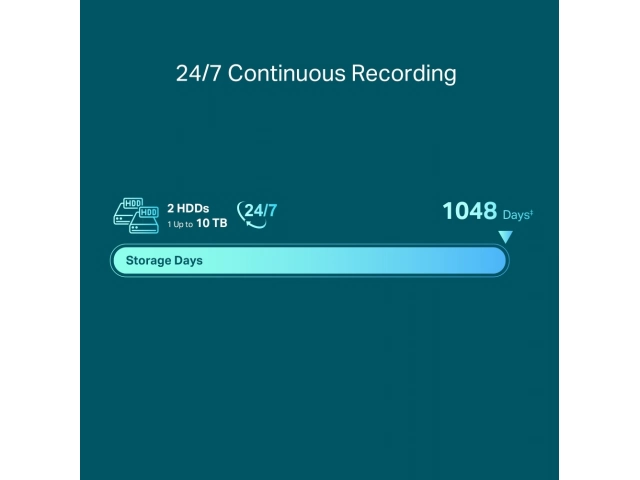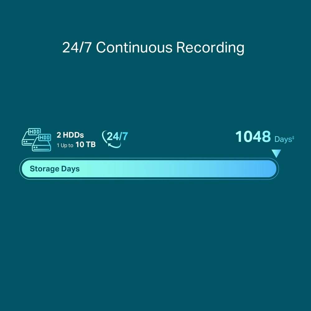 Grabación continua 24/7: Almacena hasta 20TB de metraje (1048 días de almacenamiento) de las cámaras conectadas para proteger tus datos y poder acceder a ellos de forma rápida y cómoda.
